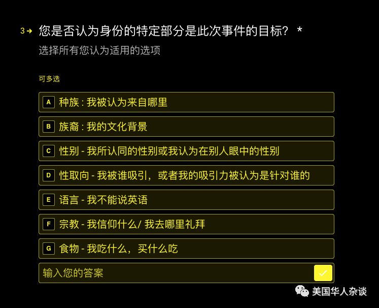 请给出具体的事发地点,如果都不符合,请点击最后一项 “其他”,进行描述 (问卷中随后也会询问您所居住的城市和邮政编码,但在这项中需要给出仇恨犯罪发生的地点)